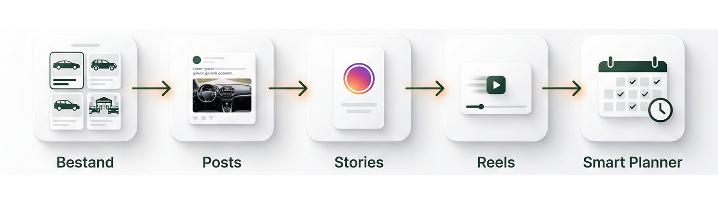 Spinic nutzt Ihren aktuellen Bestand als Grundlage für Instagram. Statt jedes Fahrzeug manuell aufzubereiten, werden neue Fahrzeuge systematisch in Posts, Stories und Reels übersetzt. So wird Ihr Autohaus regelmaessiger sichtbar, ohne dass Ihr Team jede Veröffentlichung einzeln organisieren muss.